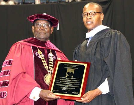 Members of the Golden Class of 1968 participated in the Spring Commencement exercises at the Von Braun Center Arena, where returning alumni and some 540 graduates listened to encouraging words from (RIGHT) Alabama House Minority Leader Anthony Daniels. Standing (LEFT) is AAMU president, Dr. Andrew Hugine, Jr.