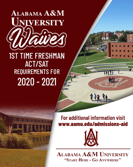In response to restrictions created by the COVID-19 pandemic, specifically the inability of high-school seniors to sit for the ACT/SAT due to social distancing, Alabama A&M University is waiving the ACT/SAT requirements for first year undergraduate applicants who meet other requirements, such as high school grade point average and curriculum. The waiver of scores applies to U.S. residents and international students.
