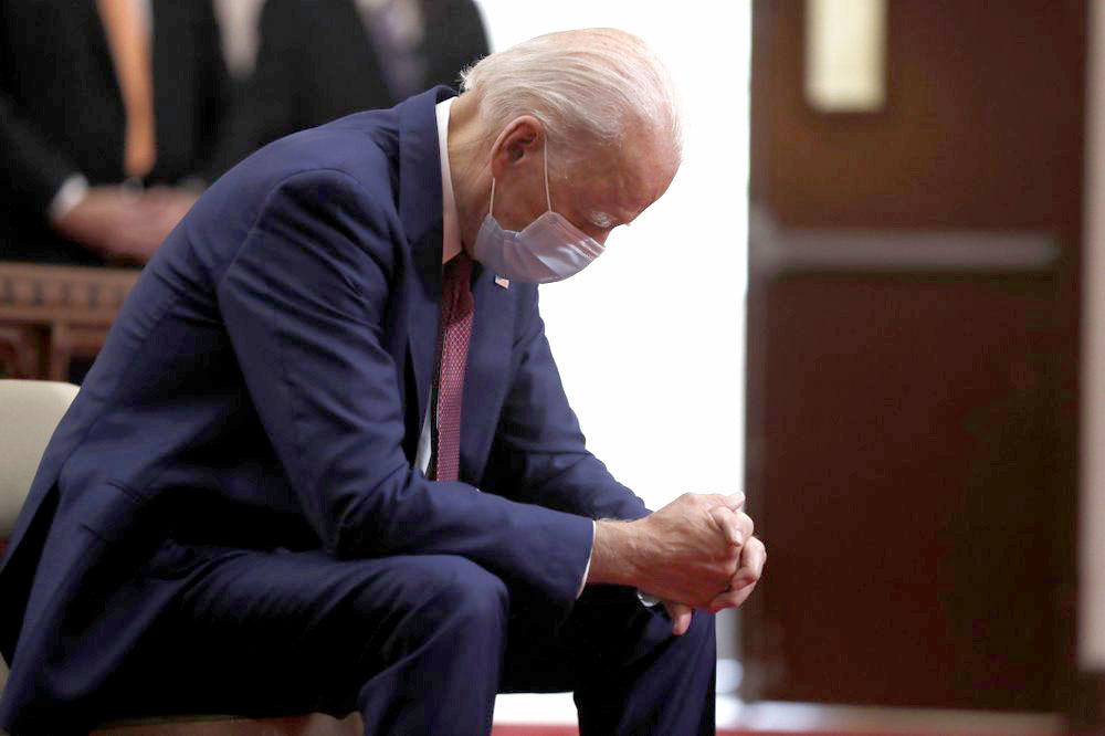 Photo Caption:(ABOVE) Democratic presidential candidate, former Vice President Joe Biden bows his head in prayer as he visits Bethel AME Church in Wilmington, Del., Monday, June 1, 2020. (AP Photo/Andrew Harnik)