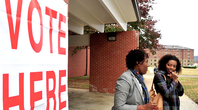 LOW TURNOUT? WE DON’T LIVE THERE! – – Above, two women chat after voting at Elmore Gym at Alabama A&M University on election day Tuesday, November 6, 2012 in Huntsville, Ala. Presently, Alabama A&M University precinct #1 had 89 ballots casted for last Tuesday’s, August 25th Municipal City Elections.