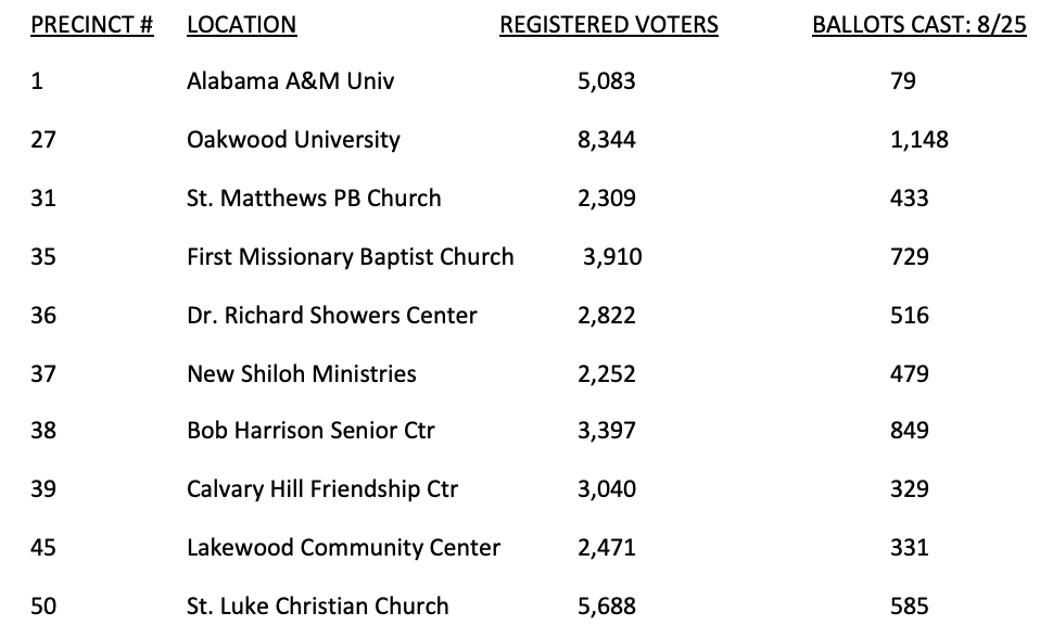In the City of Huntsville Elections of August 25, 2020, 8,948 ballots were cast by the Registered Voters in those eighteen voting precincts in NE & NW Huntsville.