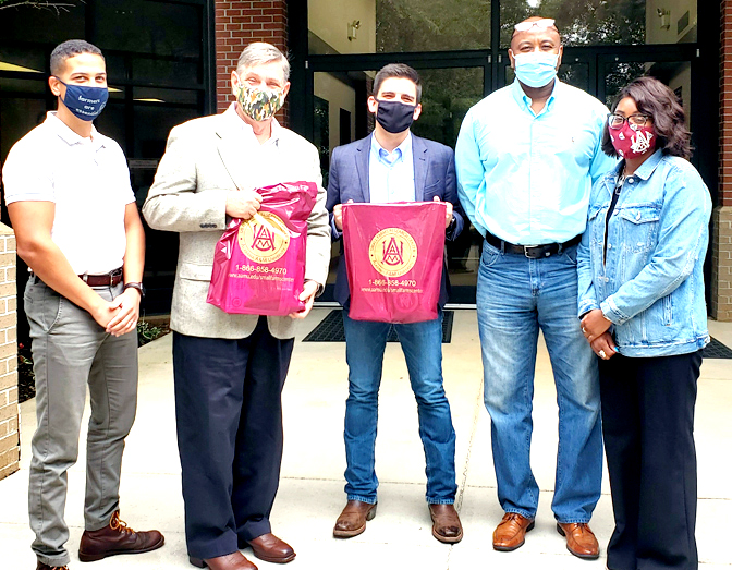 (LEFT-RIGHT) Kyle Bridgeforth, Bridgeforth Farm; Michael Beatty, director, Office of Partnership and Public Engagement (OPPE); Mitchell Baker, OPPE; Anthony Hudson, 1890 Program Liaison, Alabama A&M University (AAMU); and E’licia L. Chaverest, assistant director, AAMU Small Farms Research Center.
