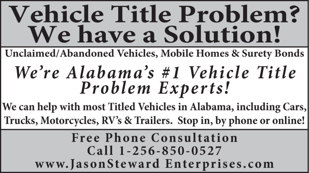 Alabama’s #1 Vehicle Title Problem Experts! Free telephone consultation. North AL 1-256-850-0527, Central AL 1-205-267-5735, South AL 1-251-342-8538.