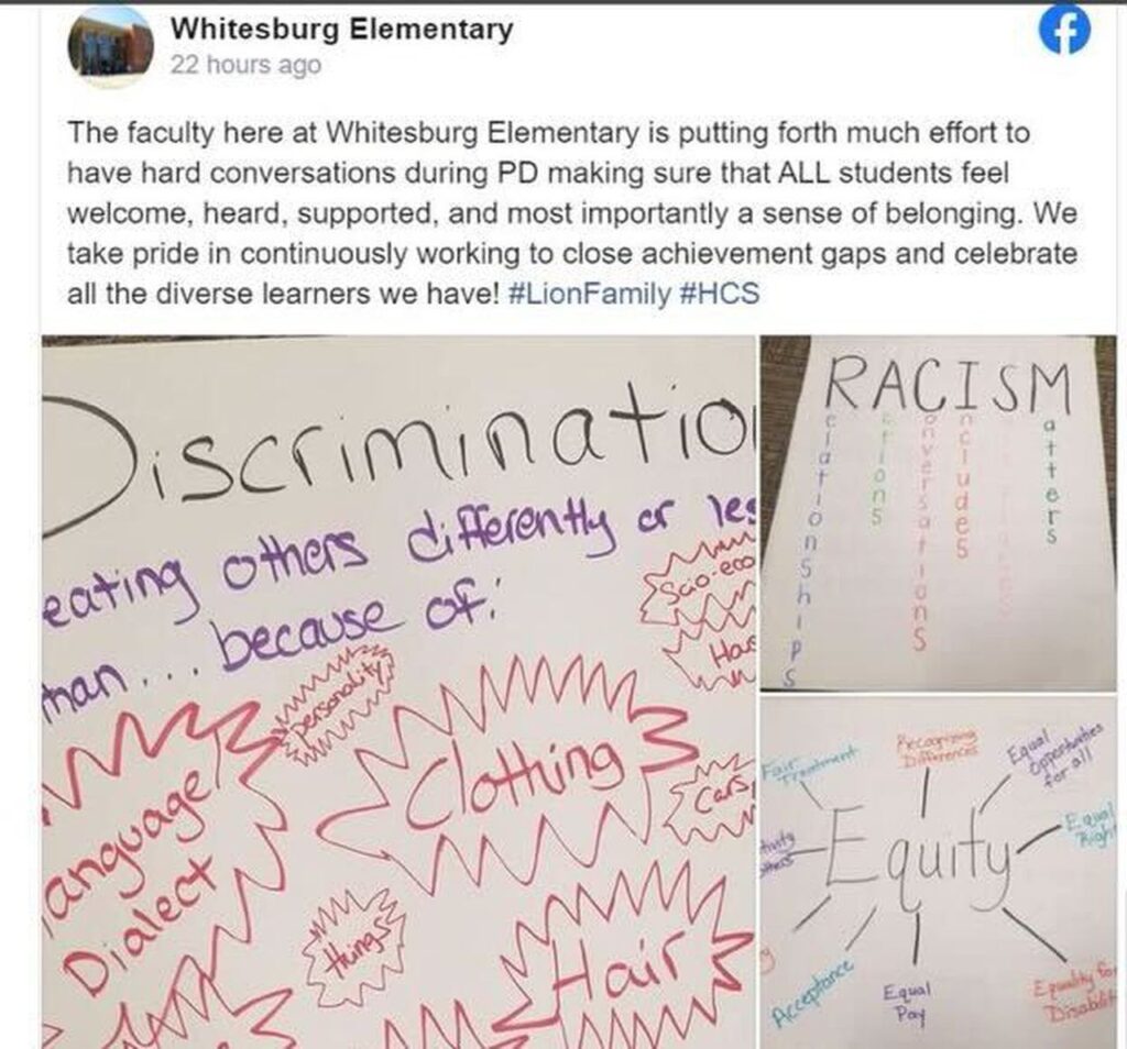 The school posted photos of writings on whiteboards with the headings of “discrimination,” “racism,” and “equity,” and the caption, “The faculty here at Whitesburg Elementary is putting forth much effort to have hard conversations during PD making sure that ALL students feel welcome, heard, supported, and most important a sense of belonging. We take pride in continuously working to close achievement gaps and celebrate all the diverse learners we have.” The post has since been removed.