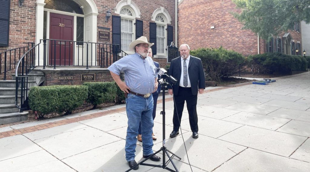 Mike Blakely speaks to reporters outside his attorney’s office in Huntsville, Ala. on Tuesday, Oct. 5, 2021. It was Blakely’s first public appearance with reporters since a judge sentenced him in his corruption case earlier this summer. Ashley Remkus