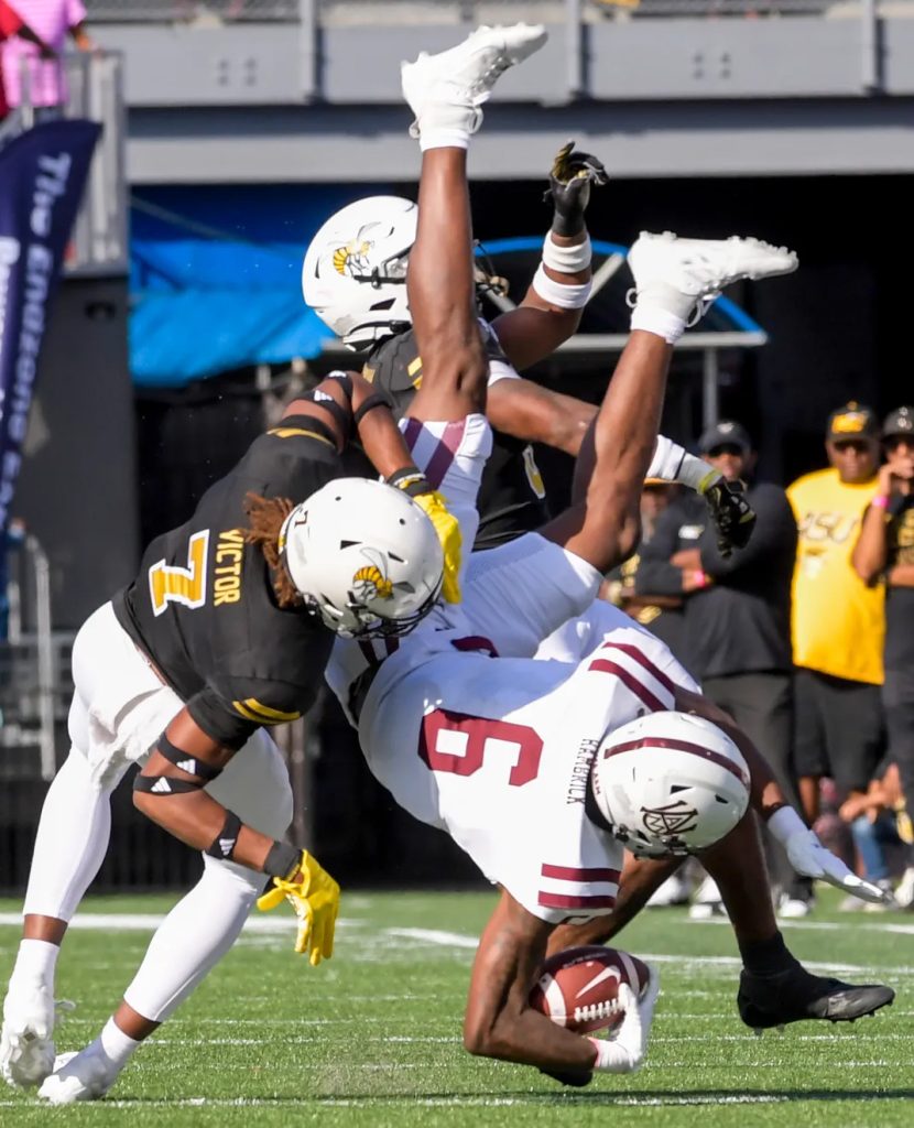 After a short kickoff gave the Hornets the ball at their own 39, Damon fired 14 yards to Ja’Won Howell with nine seconds left, they launched a Hail Mary pass to the goal line where Johnson, surrounded by three defenders, came down with the ball for a touchdown as time ran out in the half.