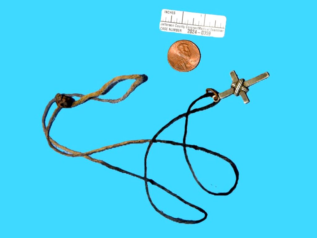 The man was wearing a black string necklace with a metal cross pendant. He was in possession of one penny.