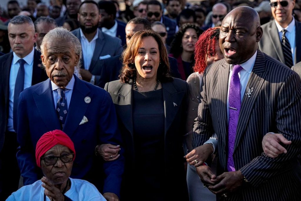 Selma Bloody Sunday March 2024 The Rev. Al Sharpton, Vice President Kamala Harris and Attorney Ben Crump walk and sing across the Edmund Pettus Bridge with others commemorating the 59th anniversary of the Bloody Sunday voting rights march in 1965, Sunday, March 3, 2024, in Selma, Ala.