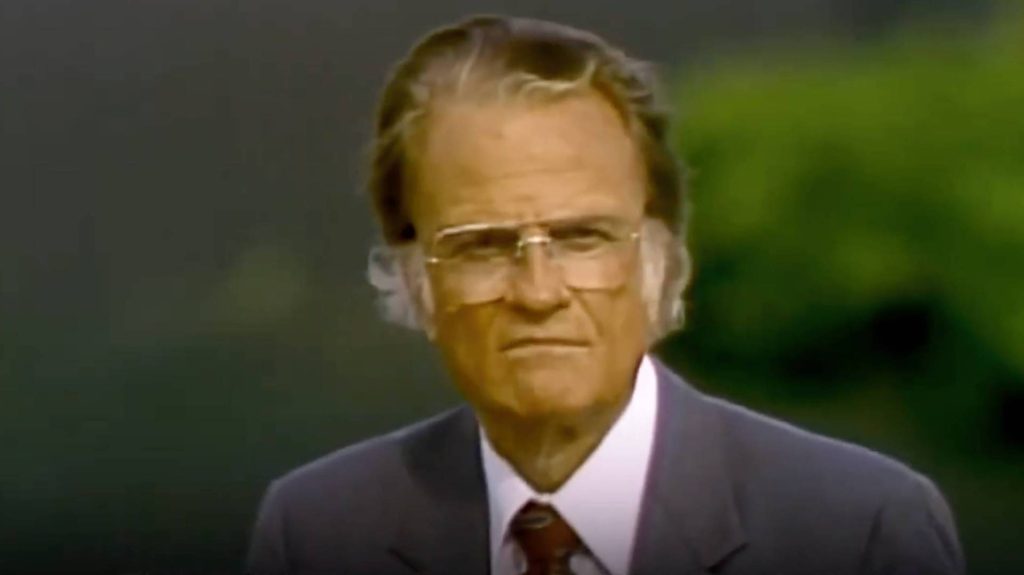 The ad begins with a clip of Billy Graham, wearing glasses, a gray suit and tie, leaning in toward a pulpit.