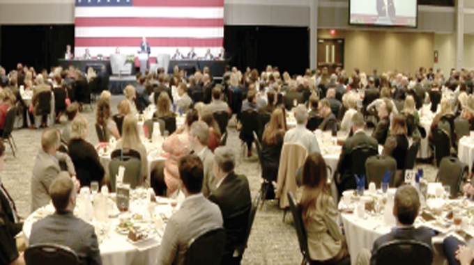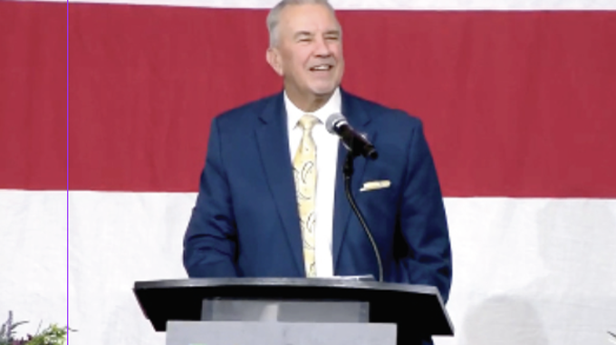 Madison County Commission Chairman Mac McCutcheon delivers the 2025 State of the County Address, celebrating progress in infrastructure, public safety, and community service before a full audience of local leaders and residents.