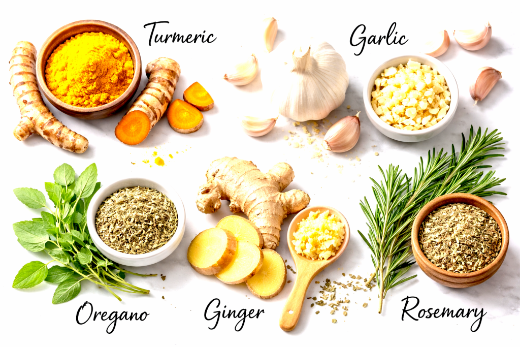 Known for its vibrant golden color, turmeric contains curcumin, a compound recognized for its anti-inflammatory and antioxidant properties. It pairs well with soups, rice, roasted vegetables, and teas. For better absorption, combine turmeric with black pepper.